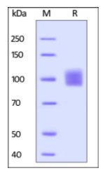 Molecular Mass : | The protein has a calculated MW of 75.7 kDa. The protein migrates as 90-120 kDa under reducing (R) condition (SDS-PAGE) due to glycosylation. |