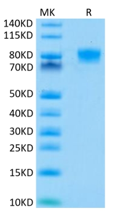 Molecular Mass : | The protein has a predicted MW of 53.4 kDa. Due to glycosylation, the protein migrates to 75-100 kDa based on Tris-Bis PAGE result. |