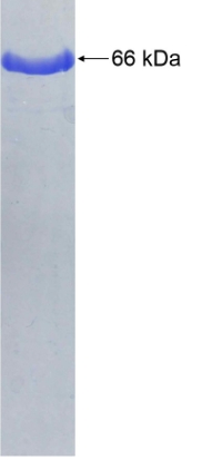 Form : | The purified protein was lyophilized from sterile phosphate-buffered saline (PBS: 58 mM Na₂HPO₄, 17 mM NaH₂PO₄, 68 mM NaCl, pH 8.0). Prior to lyophilization, 5% (w/v) trehalose and 5% (w/v) mannitol were incorporated as cryoprotective excipients. The protein was eluted with a buffer containing 100 mM reduced glutathione (GSH). |