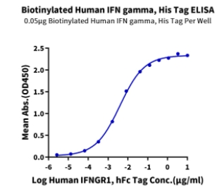 | Bio-activity : | Immobilized Biotinylated Human IFN gamma, His Tag at 0.5ug/ml (100ul/well) on the streptavidin precoated plate (5ug/ml). Dose response curve for Human IFNGR1, hFc Tag with the EC50 of 4.0ng/ml determined by ELISA. |