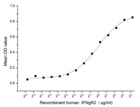 | Bio-activity : | IFNgamma R2 (Interferon gamma receptor 2; also called IFN gamma R beta IFN gamma RII, or AF1) is a 6064 kDa type I transmembrane glycoprotein that is a member of the class II cytokine receptor family of molecule). It is highly expressed on the surfaces of myeloid cells, moderately expressed on B cells, and poorly expressed on the surfaces of T cells. IFNγR2 is a cell-surface receptor that is required for interferon-γ signalling and therefore plays a critical immunoregulatory role in innate and adaptive immunity against viral and also bacterial and protozoal infections. IFNgR2 have been confirmed to mediate down-stream JAK-STAT signaling pathway in mammals. It is widely expressed as part of a preassembled cell surface multimeric complex. In the absence of IFNgamma, the complex contains two each of IFNgamma R1, R2 and Jak1 molecules. Binding of IFNgamma to IFNgamma R1 recruits Jak2 to IFN-gamma R2 and initiates phosphorylation, STAT1 binding, conformational changes and transcriptional regulation, which mainly inhibits proliferation and/or promotes apoptosis. A functional binding ELISA assay was conducted to detect the interaction of recombinant human IFNgR2 and recombinant rat JAK2. Briefly, biotin-linked IFNgR2 were diluted serially in PBS, with 0.01% BSA (pH 7.4). Duplicate samples of 100 μl were then transferred to JAK2-coated microtiter wells and incubated for 1h at 37°C. Wells were washed with PBST 3 times and incubation with Streptavidin-HRP for 30min, then wells were aspirated and washed 5 times. With the addition of substrate solution, wells were incubated 15-25 minutes at 37°C. Finally, add 50 µl stop solution to the wells and read at 450 nm immediately. The binding activity of IFNgR2 and JAK2 was shown, the EC50 for this effect is 1.02 ug/mL. |
