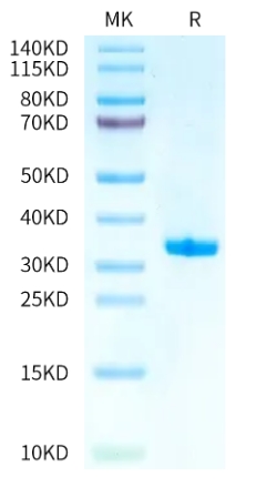 The protein has a predicted MW of 27.8 kDa. Due to glycosylation, the protein migrates to 32-38 kDa based on Bis-Tris PAGE result. |