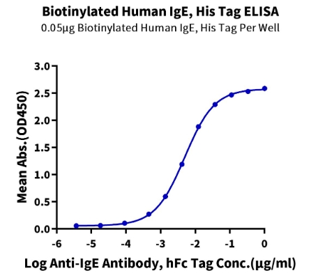 Immobilized Biotinylated Human IgE, His Tag at 0.5μg/ml (100μl/well) on the streptavidin precoated plate (5μg/ml). Dose response curve for Anti-IgE Antibody, hFc Tag with the EC50 of 5.0ng/ml determined by ELISA. |
