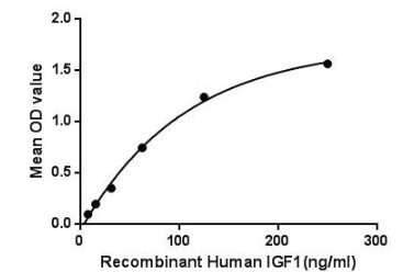 | Bio-activity : | Insulin-like growth factor 1 (IGF1), also called somatomedin C is a hormone similar in molecular structure to insulin. It plays an important role in childhood growth and continues to have anabolic effects in adults. A synthetic analog of IGF1, mecasermin, is used for the treatment of growth failure. IGF1 consists of 70 amino acids in a single chain with three intramolecular disulfide bridges. IGF1 has a molecular weight of 7,649 Daltons. Besides, Insulin Like Growth Factor Binding Protein 4 (IGFBP4) has been identified as an interactor of IGF1, thus a binding ELISA assay was conducted to detect the interaction of recombinant human IGF1 and recombinant human IGFBP4. Briefly, IGF1 were diluted serially in PBS, with 0.01% BSA (pH 7.4). Duplicate samples of 100µL were then transferred to IGFBP4-coated microtiter wells and incubated for 2h at 37°C. Wells were washed with PBST and incubated for 1h with anti-VDR pAb, then aspirated and washed 3 times. After incubation with HRP labelled secondary antibody, wells were aspirated and washed 3 times. With the addition of substrate solution, wells were incubated 15-25 minutes at 37°C. Finally, add 50µL stop solution to the wells and read at 450nm immediately. The binding activity of IGF1 and IGFBP4 was shown, and this effect was in a dose dependent manner. |