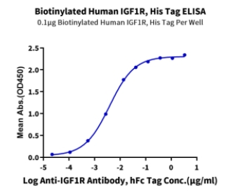 | Bio-activity : | Immobilized Biotinylated Human IGF1R, His Tag at 1μg/ml (100μl/Well) on streptavidin (5μg/ml) precoated plate. Dose response curve for Anti-IGF1R Antibody, hFc Tag with the EC50 of 3.9ng/ml determined by ELISA. |