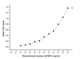 | Bio-activity : | Insulin-like growth factor-binding protein 3, also known as IGFBP3 is one of six IGF binding proteins (IGFBP1 to IGFBP6) that have highly conserved structures and bind the insulin-like growth factors IGF-1 and IGF-2 with high affinity. Within tissues, IGFBP3 can bind IGF1 and IGF2 released by many cell types, and block their access to the IGF-1 receptor (IGF1R), which is activated by both IGFs. IGFBP3 also interacts with cell-surface proteins, affecting cell signaling from outside the cell or after internalization, and also enters the cell nucleus where it binds to nuclear hormone receptors and other ligands. Besides, Fibronectin (FN) has been identified as an interactor of IGFBP3, thus a binding ELISA assay was conducted to detect the interaction of recombinant human IGFBP3 and recombinant human FN. Briefly, IGFBP3 were diluted serially in PBS, with 0.01% BSA (pH 7.4). Duplicate samples of 100ul were then transferred to FN-coated microtiter wells and incubated for 1h at 37°C. Wells were washed with PBST and incubated for 1h with anti-IGFBP3 pAb, then aspirated and washed 3 times. After incubation with HRP labelled secondary antibody, wells were aspirated and washed 5 times. With the addition of substrate solution, wells were incubated 15-25 minutes at 37°C. Finally, add 50µL stop solution to the wells and read at 450nm immediately. The binding activity of IGFBP3 and FN was shown, the EC50 was 78 ng/ml. |