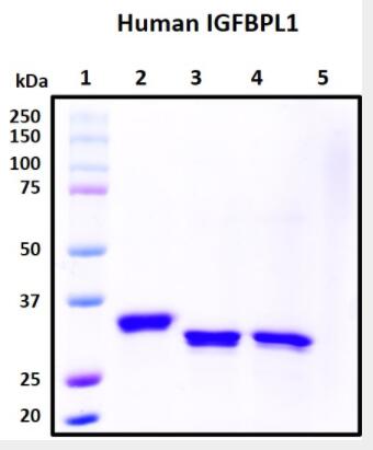 Molecular Mass : | Recombinant human IGFBPL1 protein has a calculated molecular mass of 26 kDa. Due to the glycosylation sites, it migrates as approximately 30 kDa protein bands in SDS-PAGE under DTT, beta-mercaptoethanol reducing conditions. |