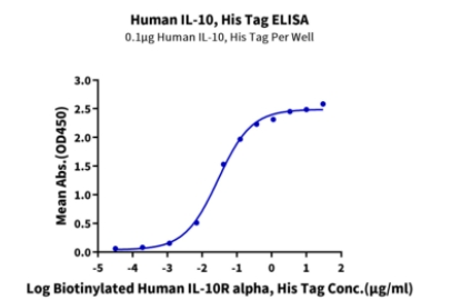 | Bio-activity : | Immobilized Human IL-10, His Tag at 1ug/ml (100ul/well) on the plate. Dose response curve for Biotinylated Human IL-10R alpha, His Tag with the EC50 of 28.7ng/ml determined by ELISA. |