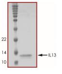 Human IL13 is expressed in activated T helper cells (resembling Th0, Th1, Th2), and T cells expressing CD8. The alpha chain of the IL13 receptor has weak binding activity for IL13. High affinity receptors are formed when the receptor alpha chains of IL13 and IL4 receptors are coexpressed. Different IL13 receptor structures have been shown to exist on various cell types and the IL13 receptor may share more than one component with IL4 receptor. IL13 down-modulates macrophage activity, reducing the production of pro-inflammatory cytokines and chemokines in response to IFN-gamma or bacterial lypopolysaccharides. IL13 enhances the production of the IL1 receptor antagonist IL1ra. IL13 also decreases the production of nitric oxide by activated macrophages, leading to a decrease in parasiticidal activity. IL13 induces differentiation of human monocytes, enhances survival time in culture, and also induces differentiation and proliferation and isotype switching in B cells. |