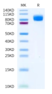 | Molecular Mass : | The protein has a predicted MW of 63.4 kDa. Due to glycosylation, the protein migrates to 78-90 kDa based on Tris-Bis PAGE result. |