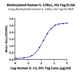 | Bio-activity : | Immobilized Biotinylated Human IL-13Ra1, His Tag at 2ug/ml (100ul/well) on the streptavidin precoated plate (5ug/ml). Dose response curve for Human IL-13, hFc Tag with the EC50 of 15.4ng/ml determined by ELISA (QC Test). |
