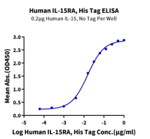 | Bio-activity : | Immobilized Human IL-15 at 2ug/ml (100ul/Well) on the plate. Dose response curve for Human IL-15RA, His Tag with the EC50 of 15.4ng/ml determined by ELISA. |