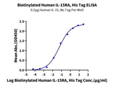 | Bio-activity : | Immobilized Human IL-15 at 2ug/ml (100ul/Well) on the plate. Dose response curve for Biotinylated Human IL-15RA, His Tag with the EC50 of 55.8ng/ml determined by ELISA. |