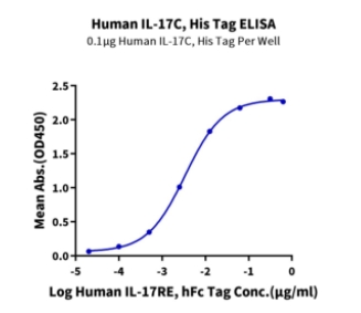 | Bio-activity : | Immobilized Human IL-17C, His Tag at 1μg/ml (100μl/well) on the plate. Dose response curve for Human IL-17RE, hFc Tag with the EC50 of 3.4ng/ml determined by ELISA. |