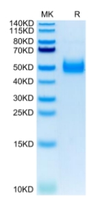 | Molecular Mass : | The protein has a predicted MW of 31.4 kDa. Due to glycosylation, the protein migrates to 45-60 kDa based on Tris-Bis PAGE result. |