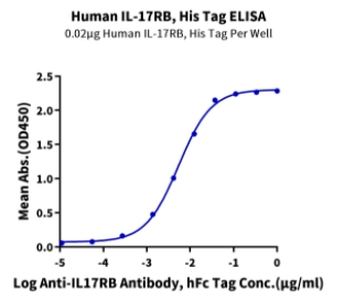 | Bio-activity : | Immobilized Human IL-17RB, His Tag at 0.2ug/ml (100ul/well) on the plate. Dose response curve for Anti-IL-17RB Antibody, hFc Tag with the EC50 of 5.4ng/ml determined by ELISA (QC Test). |