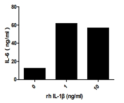 | Bio-activity : | Interleukin-1 beta belongs to the interleukin 1 cytokine family, which plays a critical role in inflammation, immunity, antiviral responses, and a variety of diseases. It has been reported that IL-1β-induced IL-6 production is mediated by both PI3K and IRAK4 in A549 cells. To test the bioactivity of IL-1β, A549 cells were seeded into 24-well plate at a density of 1x10^5 cells/mL, and allowed to attach overnight before treated with or without certain concentrations (1ng/mL, 10ng/mL) of IL1-β for 4h and IL-6 levels in the cell supernatant were determined by ELISA. |