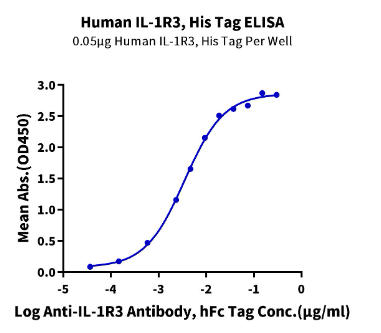 | Bio-activity : | Immobilized Human IL-1R3, His Tag at 0.5μg/ml (100μl/well) on the plate. Dose response curve for Anti-IL-1R3 Antibody, hFc Tag with the EC50 of 3.5ng/ml determined by ELISA. |