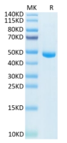 | Molecular Mass : | The protein has a predicted MW of 44.8 kDa. Due to glycosylation, the protein migrates to 45-50 kDa based on Tris-Bis PAGE result. |