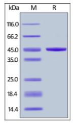 | Molecular Mass : | The protein has a calculated MW of 41.9 kDa. The protein migrates as 45 kDa under reducing (R) condition (SDS-PAGE) due to glycosylation. |