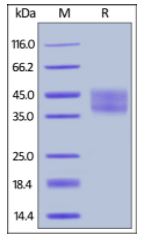 | Molecular Mass : | The protein has a calculated MW of 25.8 kDa. The protein migrates as 36-46 kDa under reducing (R) condition (SDS-PAGE) due to glycosylation. |