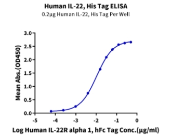 | Bio-activity : | Immobilized Human IL-22, His Tag at 2μg/ml (100μl/Well) on the plate. Dose response curve for Human IL-22R alpha 1, hFc Tag with the EC50 of 10.6ng/ml determined by ELISA. |
