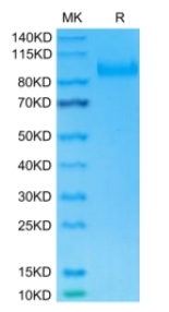 | Molecular Mass : | The protein has a predicted MW of 63.7 kDa. Due to glycosylation, the protein migrates to 80-115 kDa based on Tris-Bis PAGE result. |