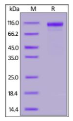 Molecular Mass : | The protein has a calculated MW of 79 kDa. The protein migrates as 105-115 kDa under reducing (R) condition (SDS-PAGE) due to glycosylation. |