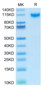 Molecular Mass : | The protein has a predicted MW of 79.3 kDa. Due to glycosylation, the protein migrates to 90-120 kDa based on Tris-Bis PAGE result. |