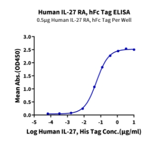 | Bio-activity : | Immobilized Human IL-27 RA, hFc Tag at 5μg/ml (100μl/well) on the plate. Dose response curve for Human IL-27, His Tag with the EC50 of 55.9ng/ml determined by ELISA. |