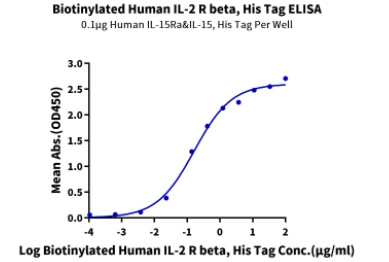 | Bio-activity : | Immobilized Human IL-15Ra&IL-15, His Tag at 1ug/ml (100ul/well) on the plate. Dose response curve for Biotinylated Human IL-2 R beta, His Tag with the EC50 of 0.16ug/ml determined by ELISA. |