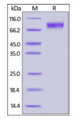 Molecular Mass : | The protein has a calculated MW of 53.5 kDa. The protein migrates as 80-90 kDa under reducing (R) condition (SDS-PAGE) due to glycosylation. |
