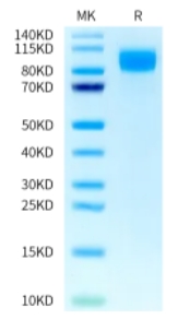 Molecular Mass : | The protein has a predicted MW of 58.2 kDa. Due to glycosylation, the protein migrates to 90-116 kDa based on Tris-Bis PAGE result. |
