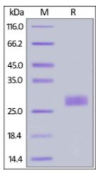 | Molecular Mass : | The protein has a calculated MW of 20.2 kDa. The protein migrates as 25-30 kDa under reducing (R) condition (SDS-PAGE) due to glycosylation. |