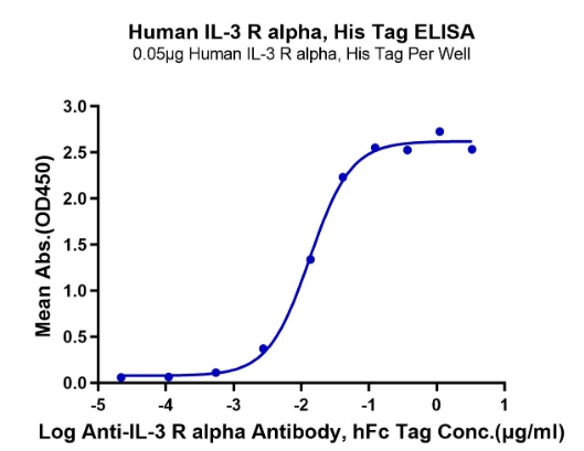 | Bio-activity : | Immobilized Human IL-3 R alpha, His Tag at 0.5μg/ml (100μl/Well) on the plate. Dose response curve for Anti-IL-3 R alpha Antibody, hFc Tag with the EC50 of 13.3ng/ml determined by ELISA. |