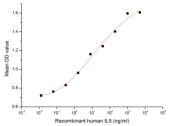 Interleukin-5 (IL-5), a secreted glycoprotein, is a member of the hematopoietic family. Interleukin 5 has been shown to stimulate the proliferation of TF-1 cells. To test this effect, TF-1 cells were seeded into triplicate wells of 96-well plates at a density of 2 x 10^4 cells/well and incubated for 72h in the presence or absence of various concentrations of recombinant human IL-5 at 37°C. The growth of cells were observed by inverted microscope and cell proliferation was measured by Cell Counting Kit-8 (CCK-8). Briefly, 10 µl of CCK-8 solution was added to each well of the plate, then measure the absorbance at 450 nm using a microplate reader after incubating the plate for 1-4 hours at 37°C . Cell proliferation of TF-1 cells after incubation with IL-5 for 72h observed by inverted microscope was shown. The dose-effect curve of recombinant human IL-5 was shown. It was obvious that it significantly promoted cell proliferation of TF-1 cells. The ED50 for this effect is typically 35 ng/ml. |