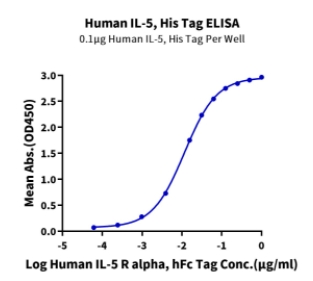| Bio-activity : | Immobilized Human IL-5, His Tag at 1ug/ml (100ul/Well) on the plate. Dose response curve for Human IL-5 R alpha, hFc Tag with the EC50 of 11.7ng/ml determined by ELISA (QC Test). |