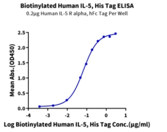 | Bio-activity : | Immobilized Human IL-5 R alpha, hFc Tag at 2ug/ml (100ul/Well) on the plate. Dose response curve for Biotinylated Human IL-5, His Tag with the EC50 of 68.2ng/ml determined by ELISA (QC Test). |
