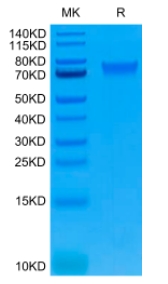 | Molecular Mass : | The protein has a predicted MW of 41.4 kDa. Due to glycosylation, the protein migrates to 65-78 kDa based on Tris-Bis PAGE result. |
