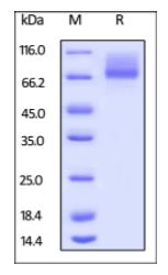 | Molecular Mass : | The protein has a calculated MW of 52.0 kDa. The protein migrates as 65-115 kDa under reducing (R) condition (SDS-PAGE) due to glycosylation. |