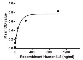 | Bio-activity : | Interleukin 8 (IL8 or chemokine (C-X-C motif) ligand 8, CXCL8) is a chemokine produced by macrophages and other cell types such as epithelial cells, airway smooth muscle cellsendothelial cells. IL-8, also known as neutrophil chemotactic factor, has two primary functions. It induces chemotaxis in target cells, primarily neutrophils but also other granulocytes, causing them to migrate toward the site of infection. IL8 also induces phagocytosis once they have arrived. IL8 is also known to be a potent promoter of angiogenesis. Besides, Syndecan 1 (SDC1) has been identified as an interactor of IL8, thus a binding ELISA assay was conducted to detect the interaction of recombinant human IL8 and recombinant human SDC1. Briefly, IL8 were diluted serially in PBS, with 0.01% BSA (pH 7.4). Duplicate samples of 100uL were then transferred to SDC1-coated microtiter wells and incubated for 2h at 37°C. Wells were washed with PBST and incubated for 1h with anti-IL8 pAb, then aspirated and washed 3 times. After incubation with HRP labelled secondary antibody, wells were aspirated and washed 3 times. With the addition of substrate solution, wells were incubated 15-25 minutes at 37°C. Finally, add 50µL stop solution to the wells and read at 450nm immediately. The binding activity of IL8 and SDC1 was shown, and this effect was in a dose dependent manner. |