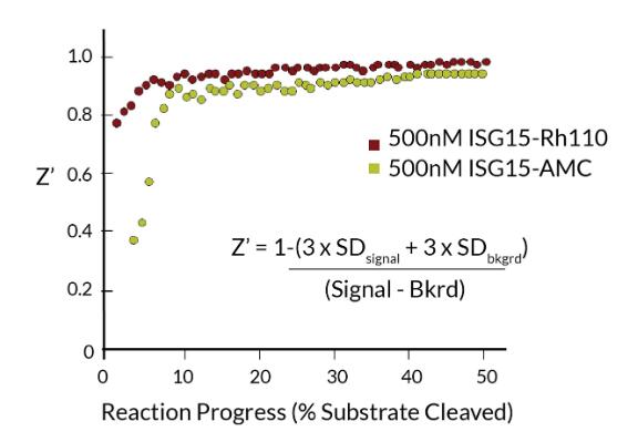 | Product Overview : | This product consists of a full-length, mature ISG15 polypeptide (amino acids 2-157) recombinantly expressed in E.coli, conjugated on its c-terminus to a quenched Rhodamine110 dye. Hydrolysis of the conjugate results in fluorescence observable by excitation at 485nm and emission at 535nm, which substantially reduces the risk of autofluorescence of compounds in screenings. Typical working range is 50-500nM. |