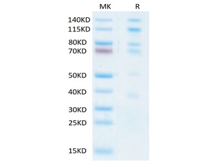 The protein has a predicted MW of 112. 5 kDa (P13612) & 81. 3 kDa (P26010). Due to glycosylation, the protein migrates to 70 kDa, 80 kDa and 130-150 kDa & 100-120 kDa based on Bis-Tris PAGE result |