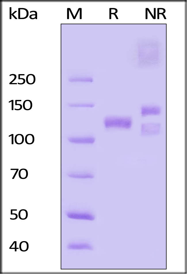 | Product Overview : | Recombinant Human ITGA6 & ITGB1 Heterodimer Protein, His-tagged contains Phe 24 - Gly 1012 (Integrin alpha 6, P23229-2) and Gln 21 - Asp 728 (Integrin beta 1, P05556-1) was co-expressed in human 293 cells (HEK293) at ACRObiosystems. Predicted N-terminus: Phe 24 (ITGA6) & Gln 21 (ITGB1). Human ITGA6 & ITGB1 Heterodimer Protein, produced by co-expression of ITGA6 and ITGB1, has a calculated MW of 116.8 kDa (ITGA6) and 83.7 kDa (ITGB1). Subunit ITGA6 is fused with an acidic tail at the C-terminus and followed by a polyhistidine tag and subunit ITGB1 contains no tag but a basic tail at the C-terminus. The predicted N-terminus is Phe 24 (ITGA6) & Gln 21 (ITGB1). As a result of glycosylation, the protein migrates as 120-130 kDa under reducing (R) condition, and 100-125 kDa and 130-150 kDa under non-reducing (NR) condition (SDS-PAGE). |