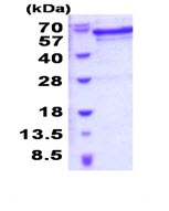 JMJD6 also known as bifunctional arginine demethylase and lysyl-hydroxylase JMJD6. JMJD6 acts as a lysyl-hydroxylase that catalyzes 5-hydroxylation on specific lysine residues of target proteins such as u2AF2/u2AF65 and LuC7L2, as a regulator of RNA splicing by mediating 5-hydroxylation of u2AF2/u2AF65, affecting the pre-mRNA splicing activity of u2AF2/u2AF65. In addition to peptidyl-lysine 5-dioxygenase activity, may act as an RNA hydroxylase, as suggested by its ability to bind single strand RNA. Also acts as an arginine demethylase which demethylates histone H3 at 'Arg-2' (H3R2me) and histone H4 at 'Arg-3' (H4R3me), thereby playing a role in histone code. Recombinant human JMJD6, fused to His-tag at N-terminus, was expressed in E. coli and purified by using conventional chromatography. |