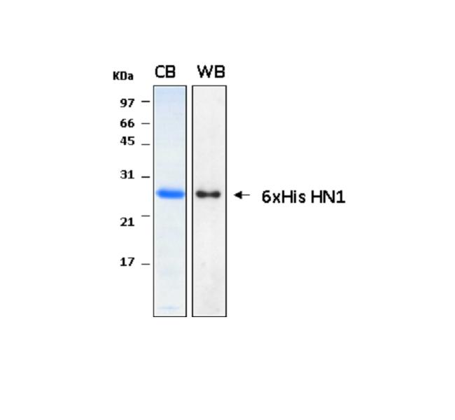 >95% confirmed by 10% SDS-PAGE stained with Coomassie Blue (CB), immunobloting with anti-6xHis (WB). |