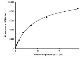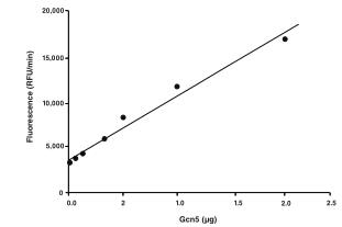 | Unit Definition : | One unit is defined as the amount of enzyme required to convert 1 nmol of acetyl-CoA to reduced Coenzyme A (CoASH) per minute at 37 centigrade in 100 mM HEPES, pH 7.5, containing 0.8% polysorbate 20. CoASH produced in the reaction is measured fluorometrically using HAT Inhibitor Screening Assay Kit with 100 µM histone H3 peptide (1-21) as the acetyl acceptor. |