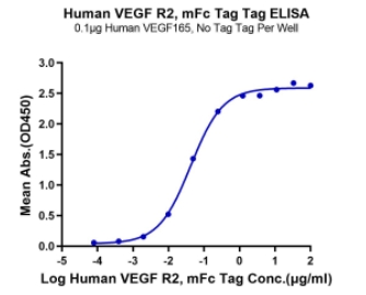 | Bio-activity : | Immobilized Human VEGF165 1ug/ml (100ul/Well) on the plate. Dose response curve for Human VEGF R2, mFc Tag with the EC50 of 42.3ng/ml determined by ELISA. |