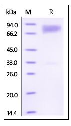| Molecular Mass : | The protein has a calculated MW of 51.2 kDa. The protein migrates as 66-80 kDa under reducing (R) condition (SDS-PAGE) due to glycosylation. |
