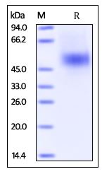 | Molecular Mass : | The protein has a calculated MW of 25.4 kDa. The protein migrates as 45-55 kDa under reducing (R) condition (SDS-PAGE) due to glycosylation. |